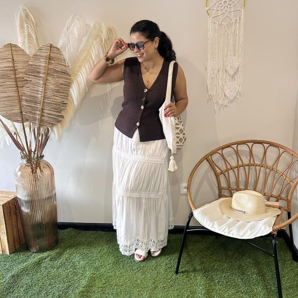 Craquez pour le charme naturel du top Claudia marron en crochet, une pièce élégante au style bohème chic. Sa maille texturée apporte du relief et du caractère, tandis que sa coupe sans manches en fait un incontournable de mi-saison et d’été.