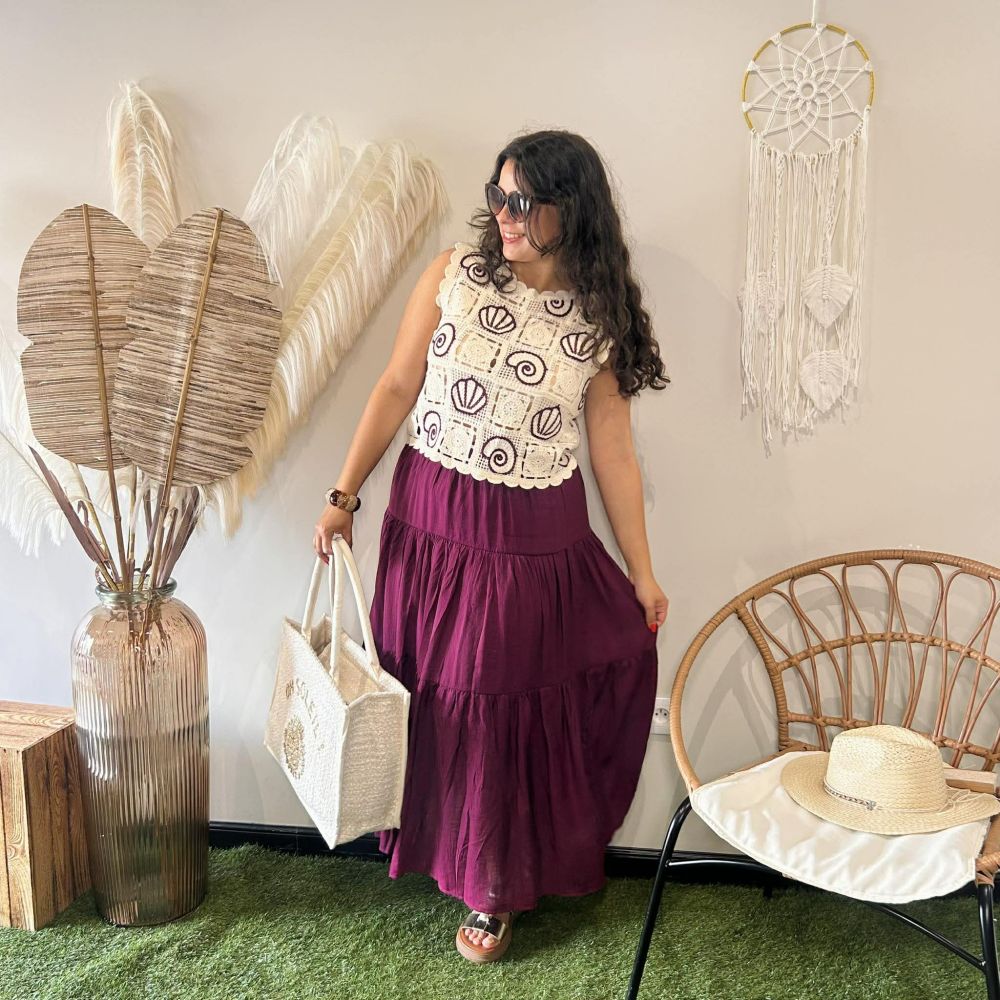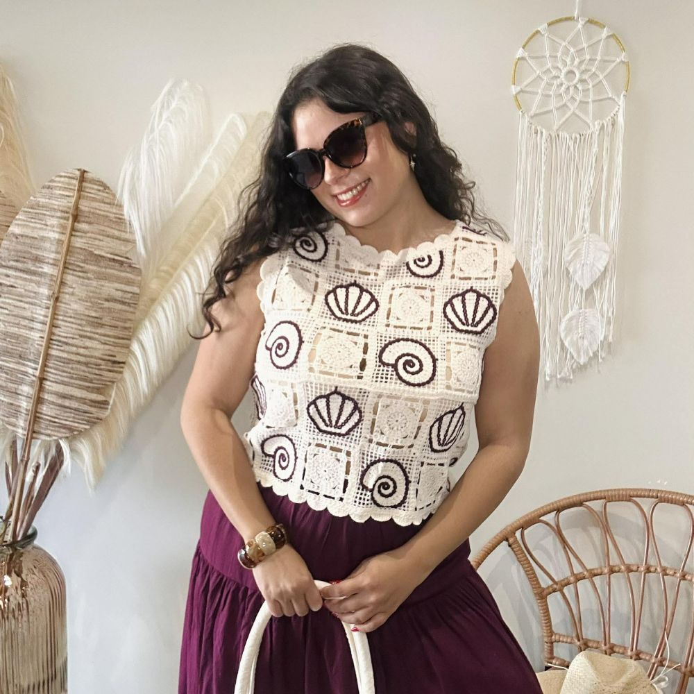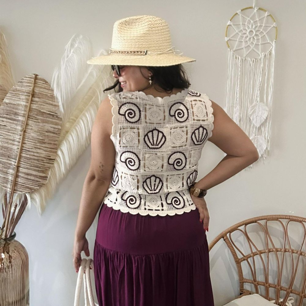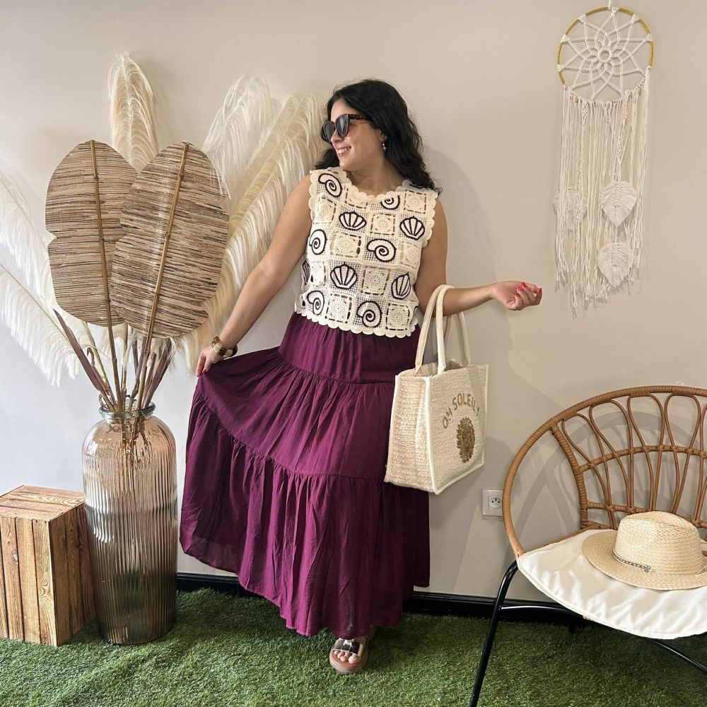 Le top Illona est une pièce pleine de charme qui sent bon l’été. Réalisé en crochet délicat, il séduit par ses motifs coquillages contrastés dans une teinte prune qui apporte originalité et caractère.