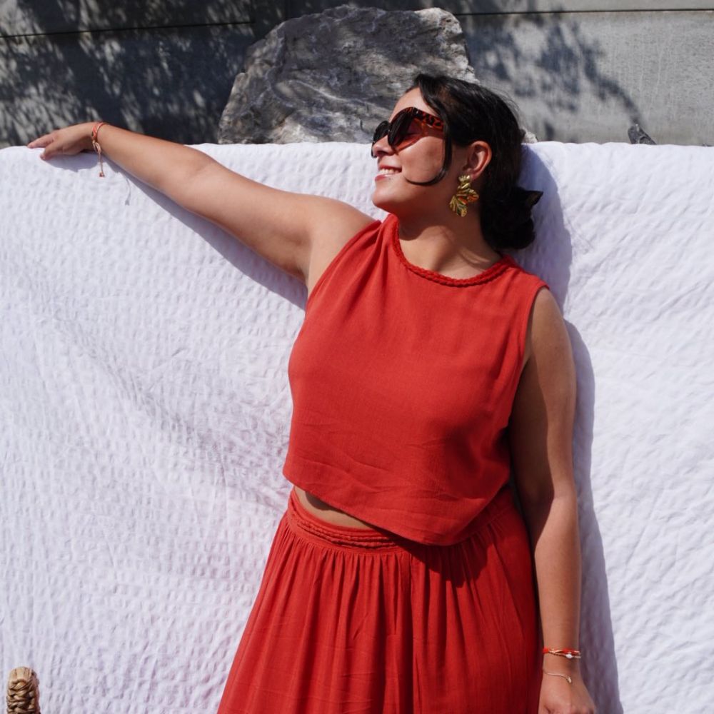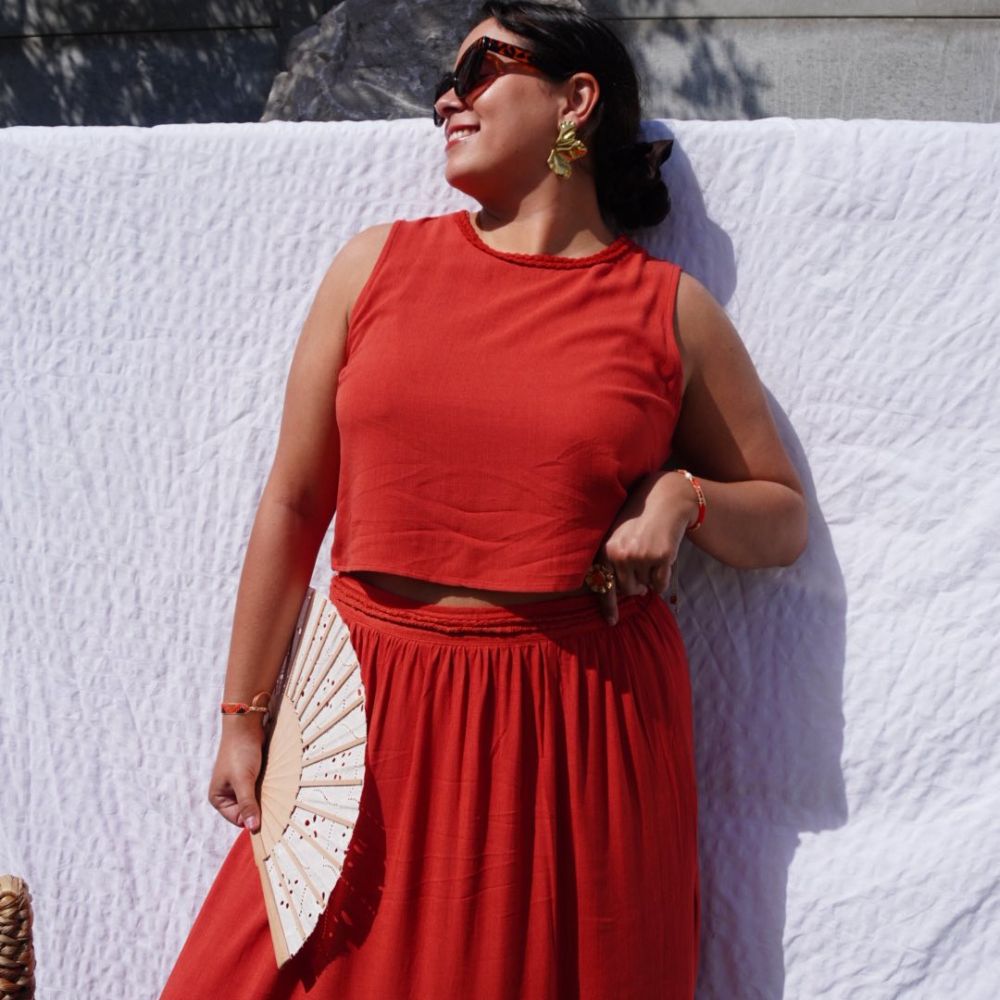 Facile à porter au quotidien comme en occasion, il se marie parfaitement avec la jupe Rita pour un ensemble harmonieux aux accents solaires et élégants.