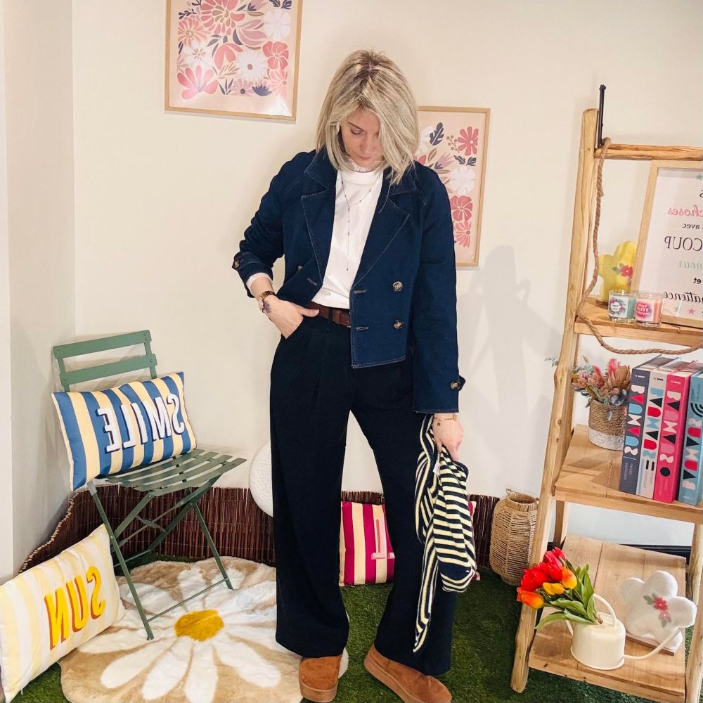 Le détail qui fait toute la différence : sa ceinture intégrée dans le dos, qui permet de souligner la taille tout en gardant un joli tombé, sans trop serrer. Résultat : une silhouette mise en valeur et une veste qui structure instantanément le look.