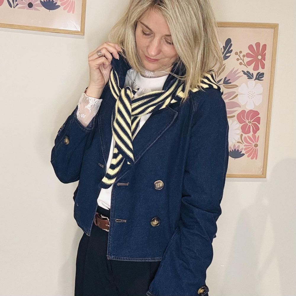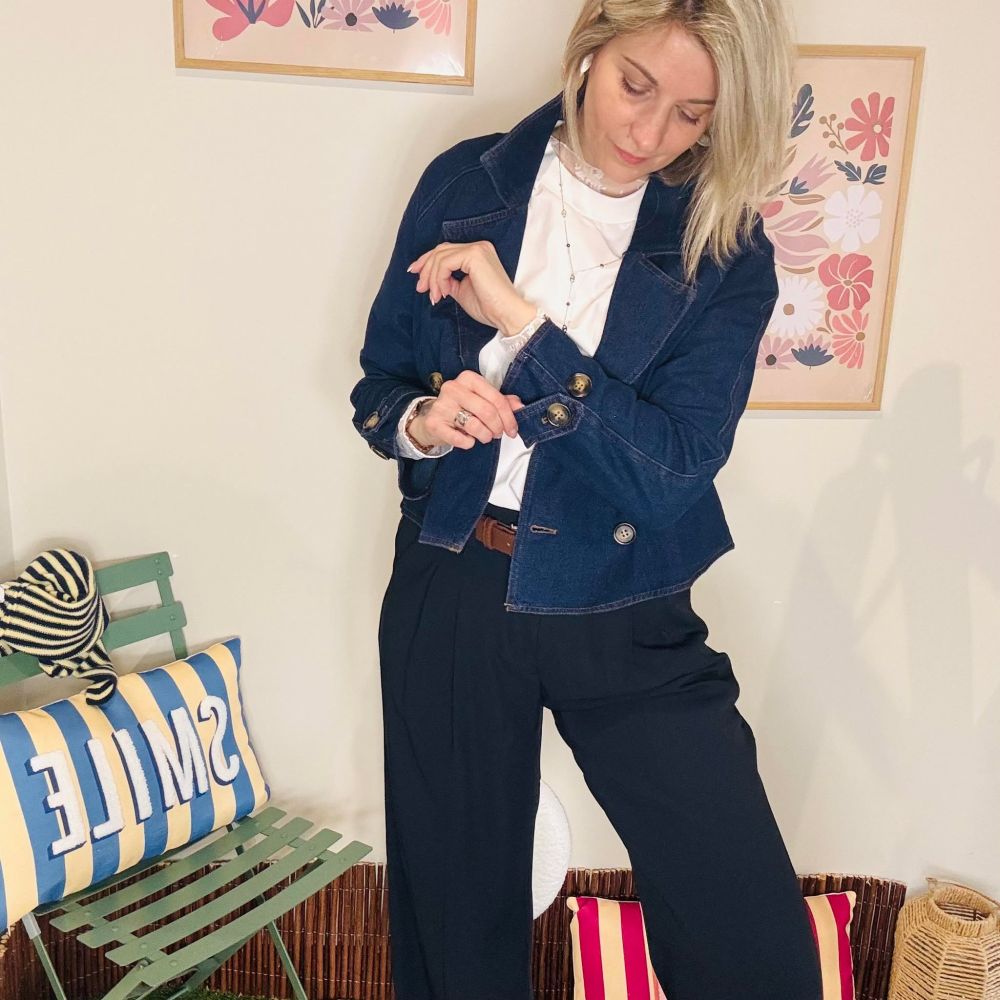 On adore ses boutons motif écaille qui apportent une touche raffinée et contrastent joliment avec le bleu profond. Sa coupe est à la fois féminine et confortable, idéale pour la mi-saison comme pour les journées plus fraîches.