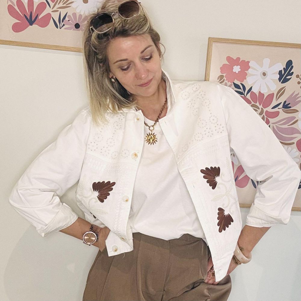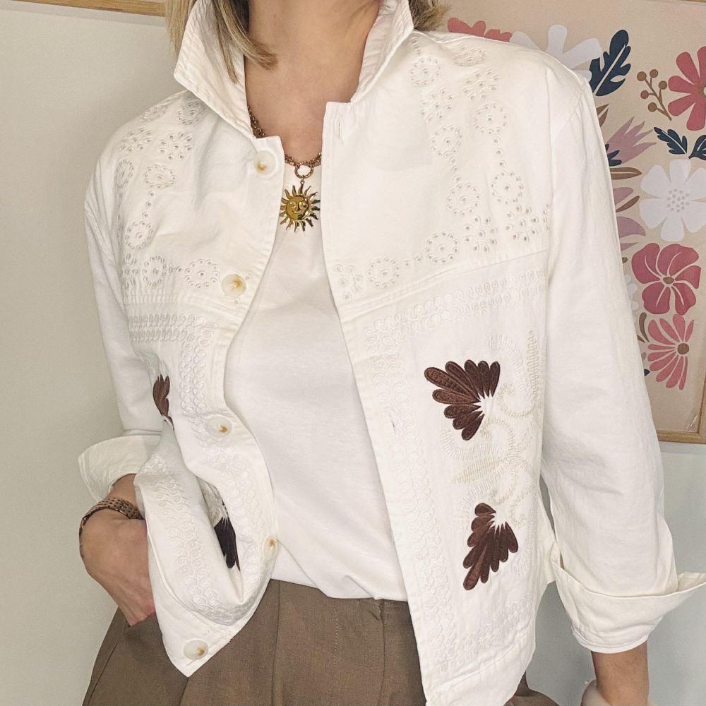 Veste Carter Blanche – Broderies Écru & Marron