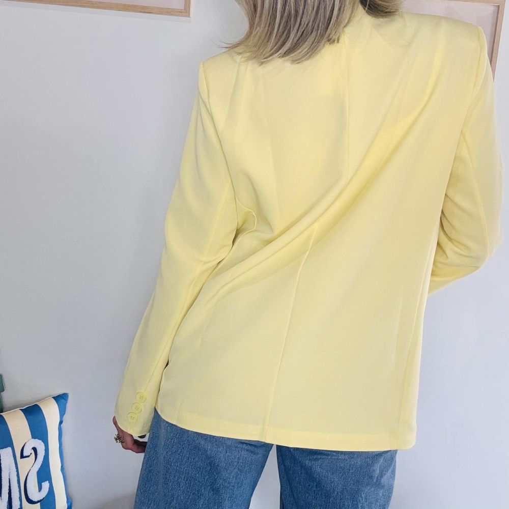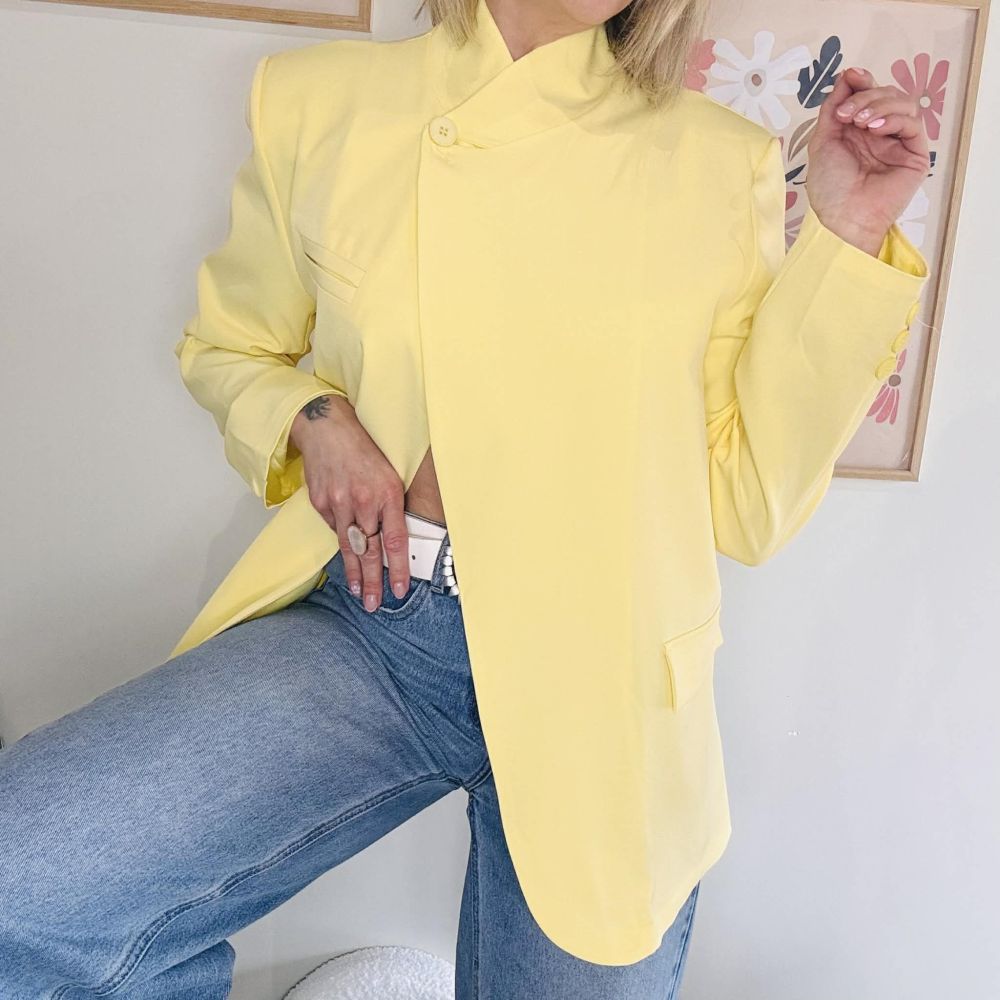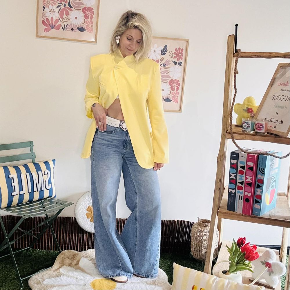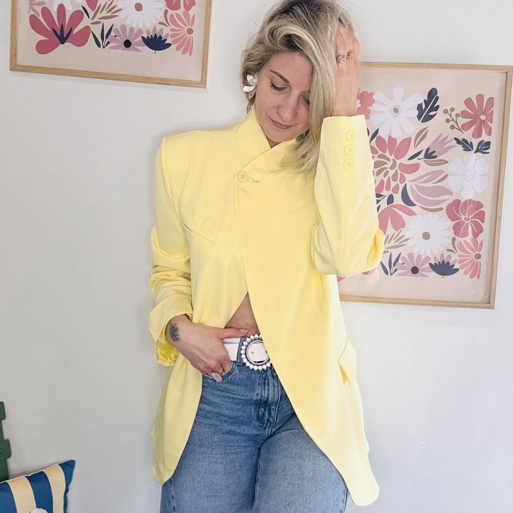Apportez une touche de lumière et d’élégance à votre dressing avec le blazer Coline jaune pastel, une pièce forte qui allie sophistication et modernité. Sa coupe structurée aux épaules marquées et son fermeture croisée asymétrique en font une veste originale et tendance, idéale pour sublimer vos tenues du quotidien comme vos looks plus habillés.