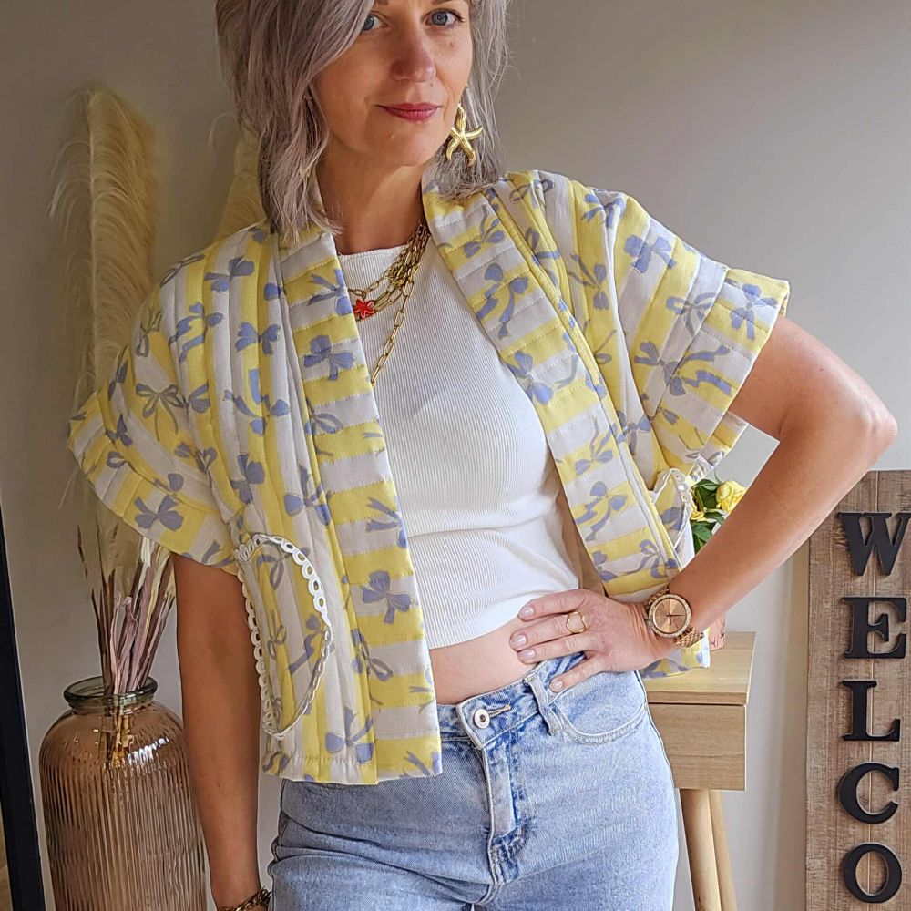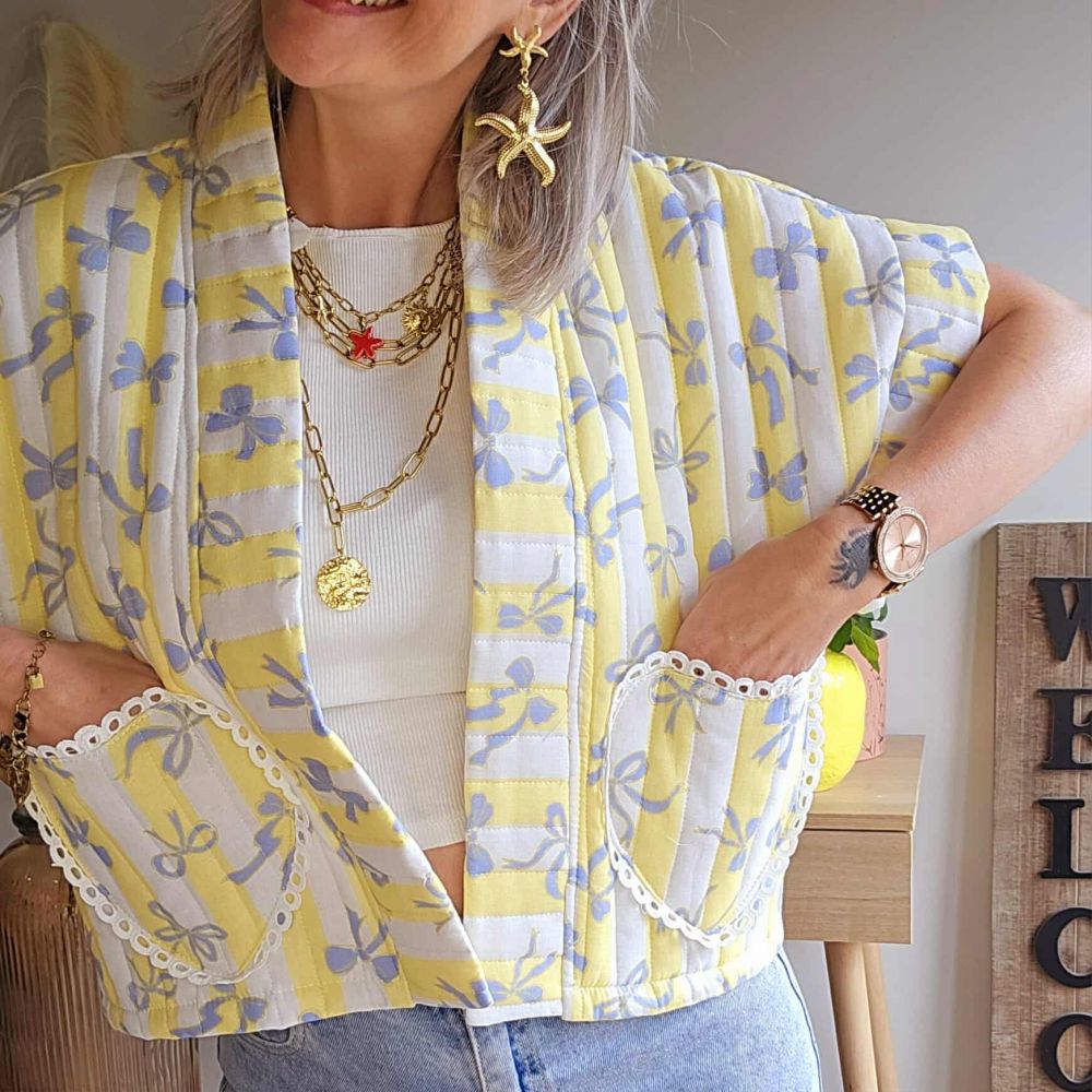 Veste matelassée jaune blanc et petit nœud bleu, poche en forme de cœur brodé, esprit bohème. Idéale pour une entrée de saison ou en soirée fraiche