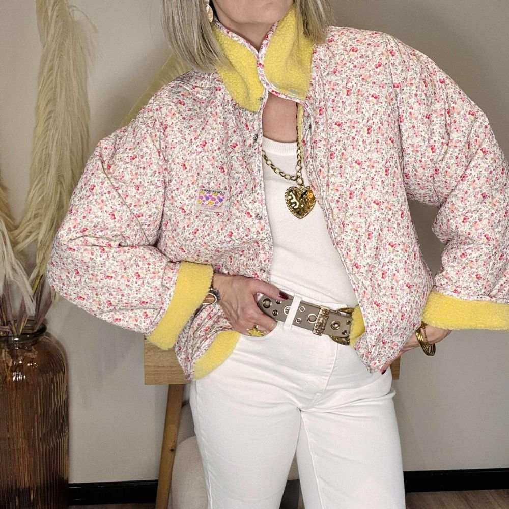 Confectionné dans un délicat imprimé floral aux tons doux et lumineux, ce côté révèle une allure féminine et raffinée. Sur la poitrine, un patch cousu apporte une touche signature et authentique, soulignant le caractère unique de la pièce. Les finitions en bouclette jaune au col et aux poignets créent un joli contraste et rappellent l’autre face du modèle.
