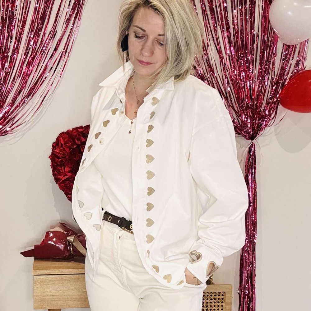 Veste / Surchemise LOLA – Jean blanc & cœurs taupe