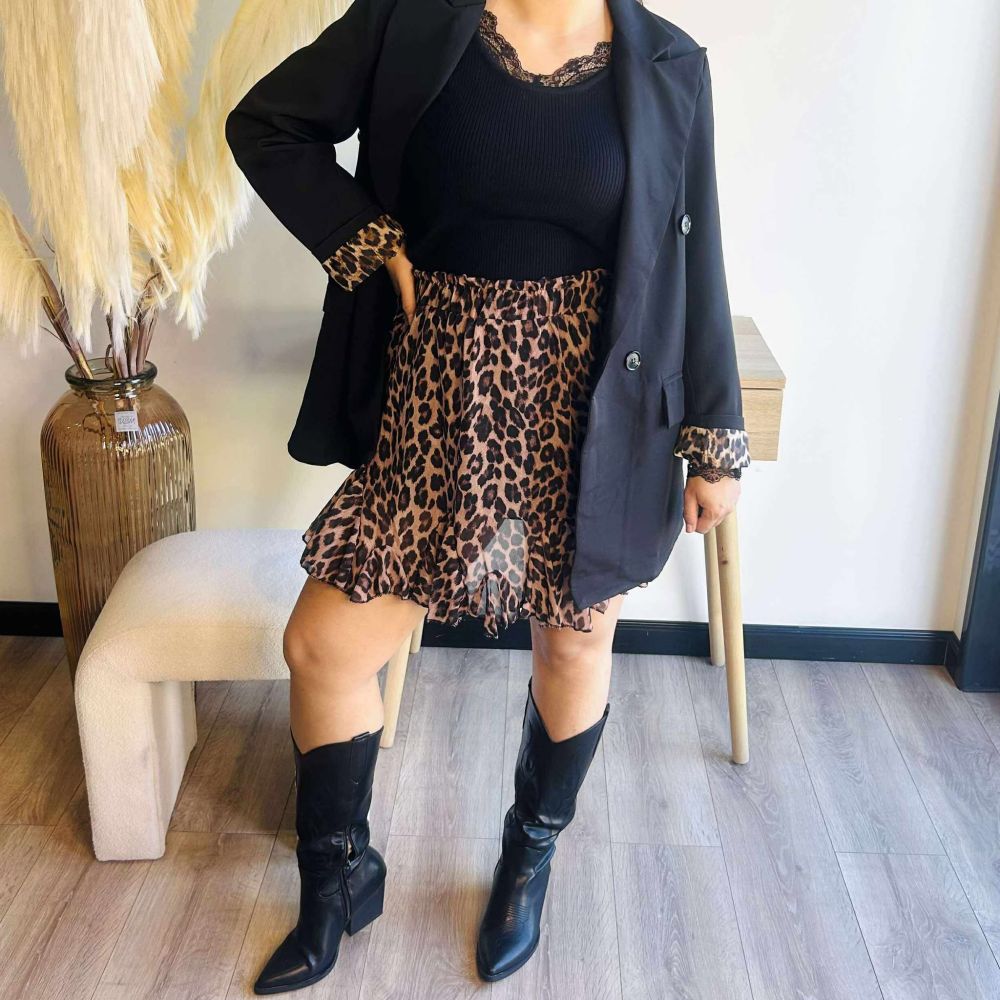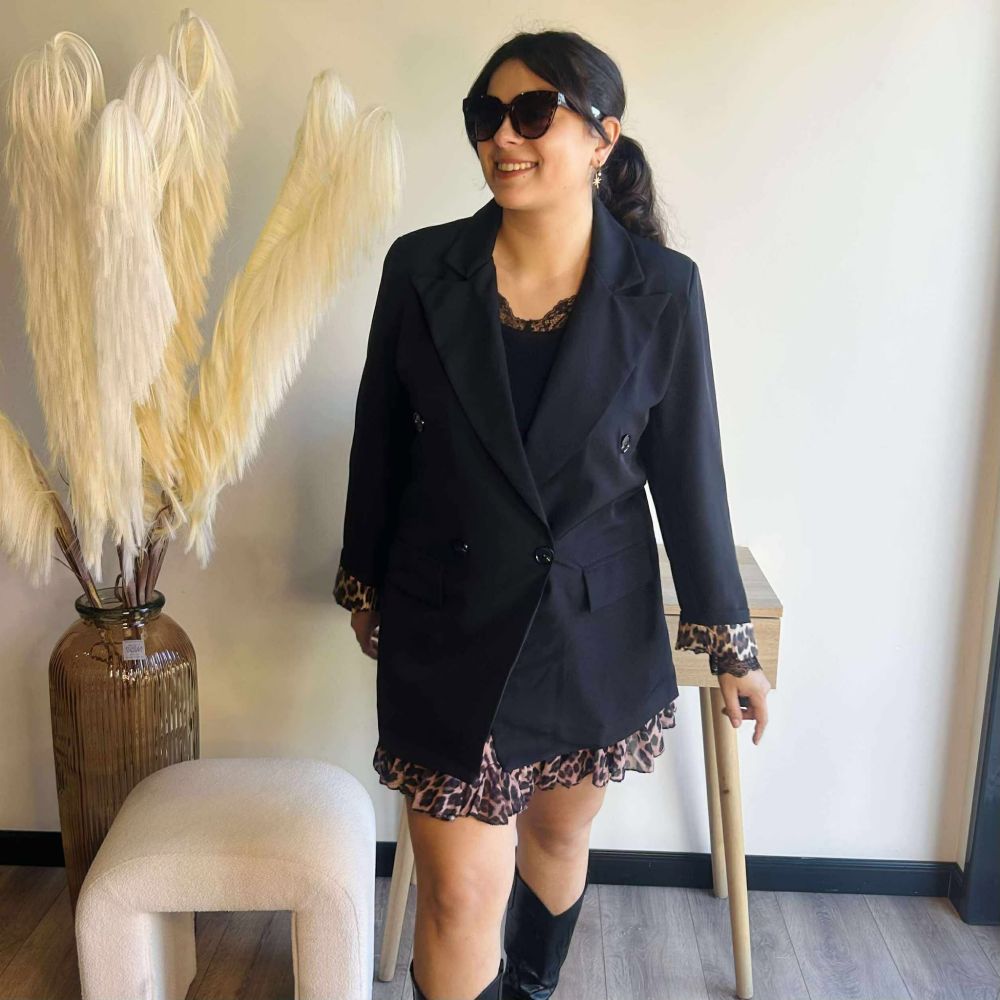 La veste Solène est un blazer noir femme chic et moderne, rehaussé par des détails léopard sur les manches pour un look élégant et tendance. Sa fermeture croisée à boutons permet de la porter ouverte ou fermée selon vos envies. Parfaite en veste habillée pour le bureau, en blazer tendance pour vos sorties, ou pour donner du style à une tenue casual avec un jean.